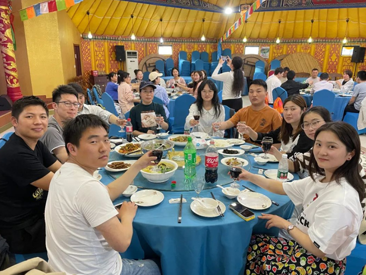 結(jié)束頒獎后,一行人談笑風(fēng)生地步行前往“蒙古大營”,走進用餐區(qū),一個個或大或小的蒙古包映入眼簾,落日余暉下的風(fēng)景讓人深感民族特色。大家圍坐在桌旁,享用美味晚餐,幸運的我們還觀賞到蒙古族歌曲、舞蹈、和馬頭琴的驚喜表演。